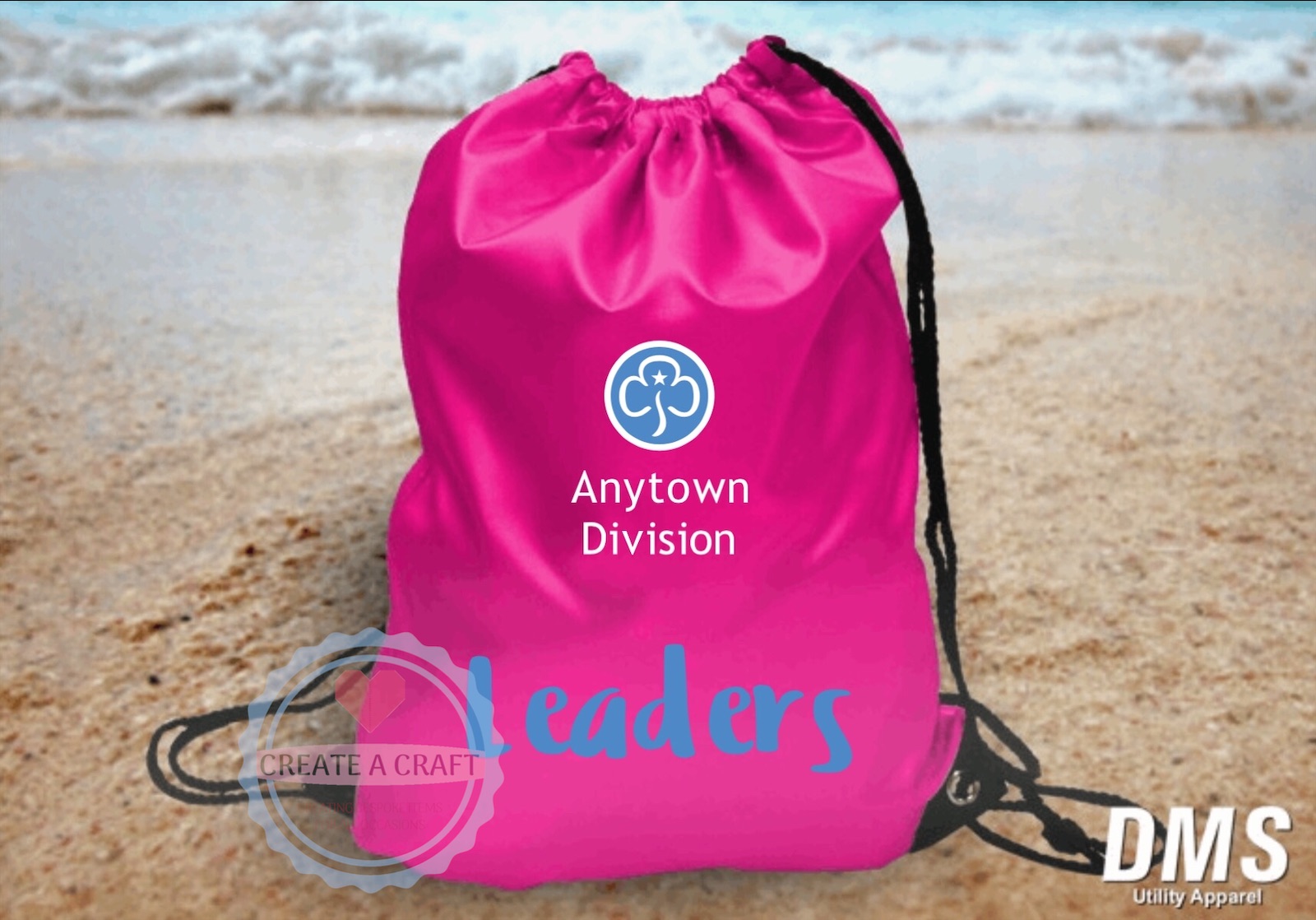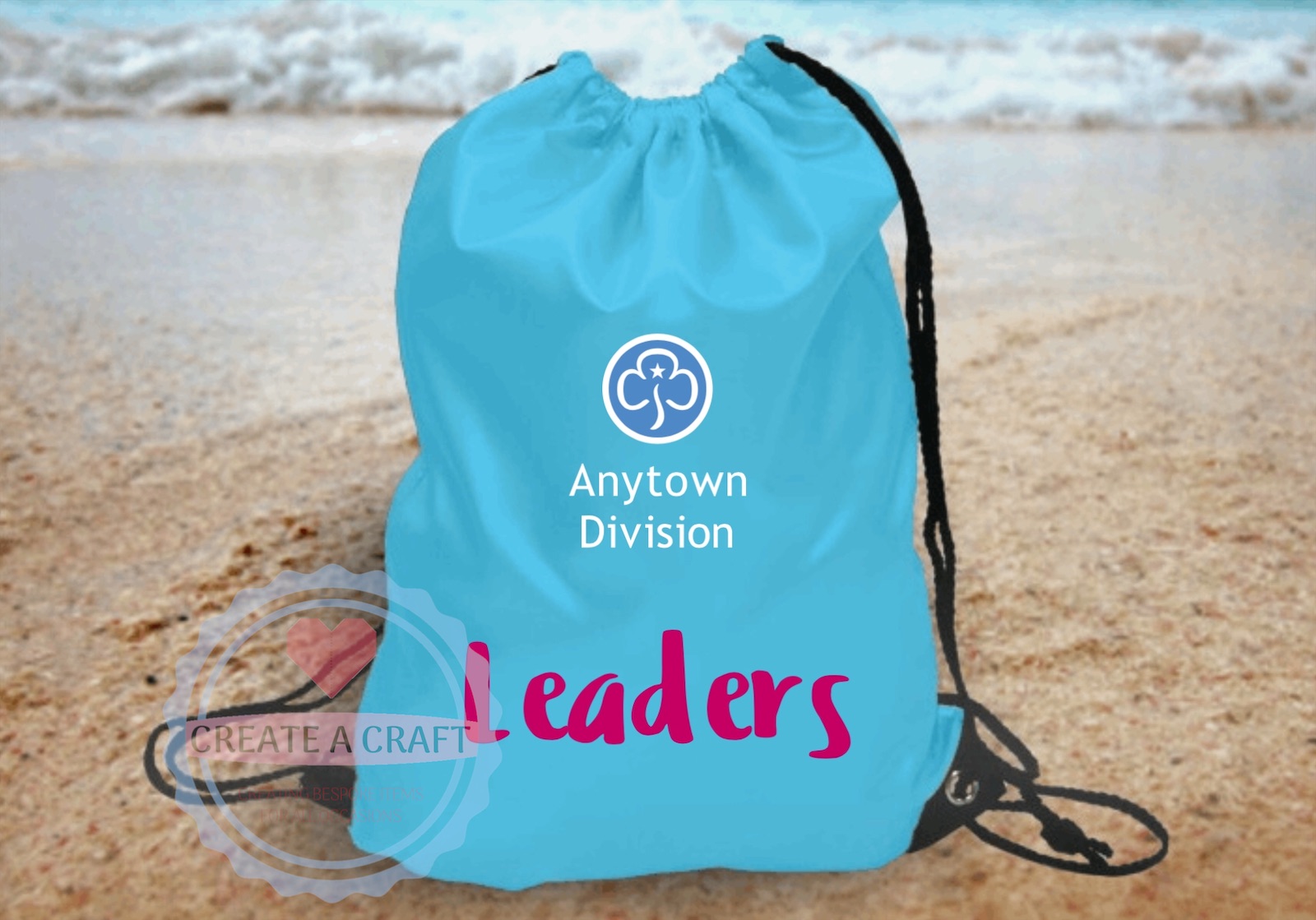 Designed for Leaders or Unit Helpers, personalised with name, Girlguiding trefoil and Unit/Area name. A water-resistant drawstring backpack with strong nylon cord carry handles. Reinforced corners with metal eyelets. Ideal for Girlguiding trips, so you don't get your bag mixed up with anyone elses, also easily identifyable at large scale events. Also perfect as a pot bag on camp.