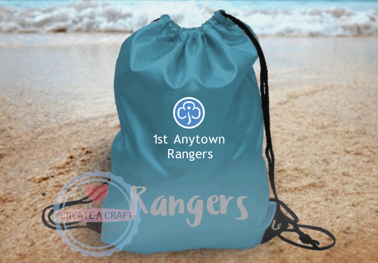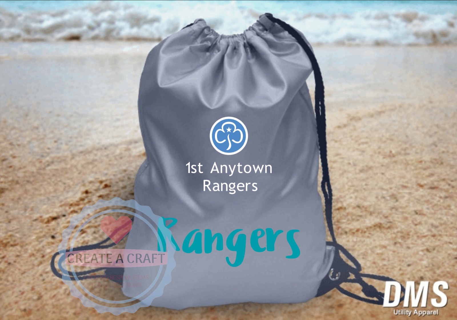 Designed for Rangers, personalised with girls’ name, Girlguiding trefoil and Unit/Area name. A water-resistant drawstring backpack with strong nylon cord carry handles. Reinforced corners with metal eyelets. Ideal for Girlguiding trips, so the girls don't get their bag mixed up with anyone elses, also easily identifyable at large scale events. Also perfect as a pot bag on camp.