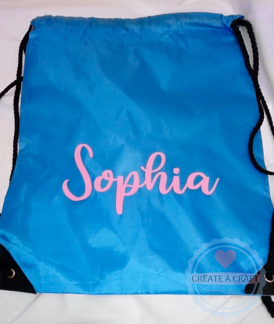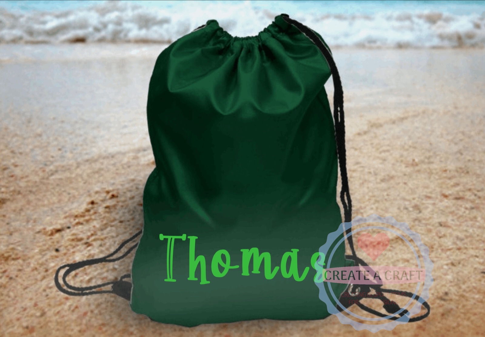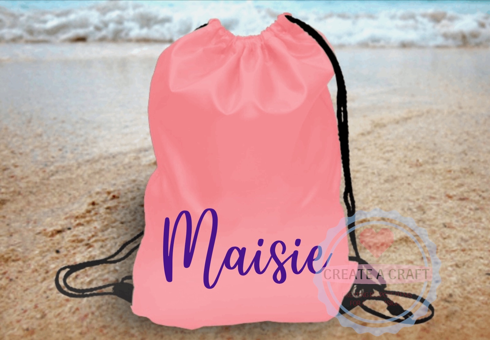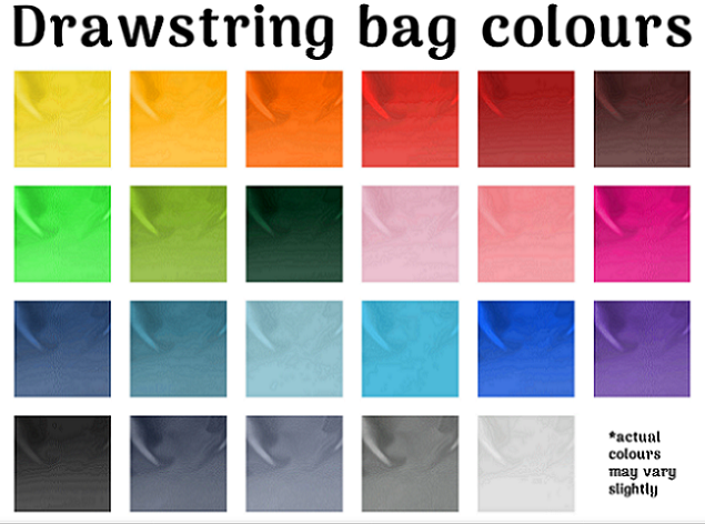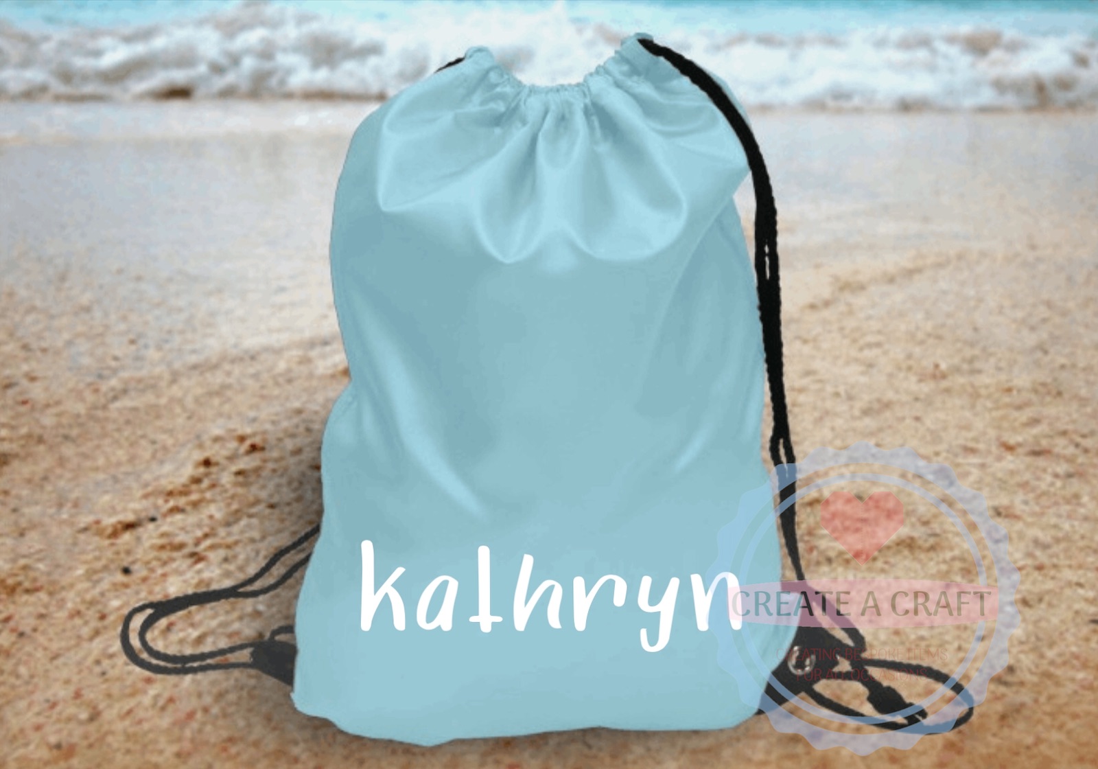 Water-resistant drawstring backpack with strong nylon cord carry handles. Reinforced corners with metal eyelets.