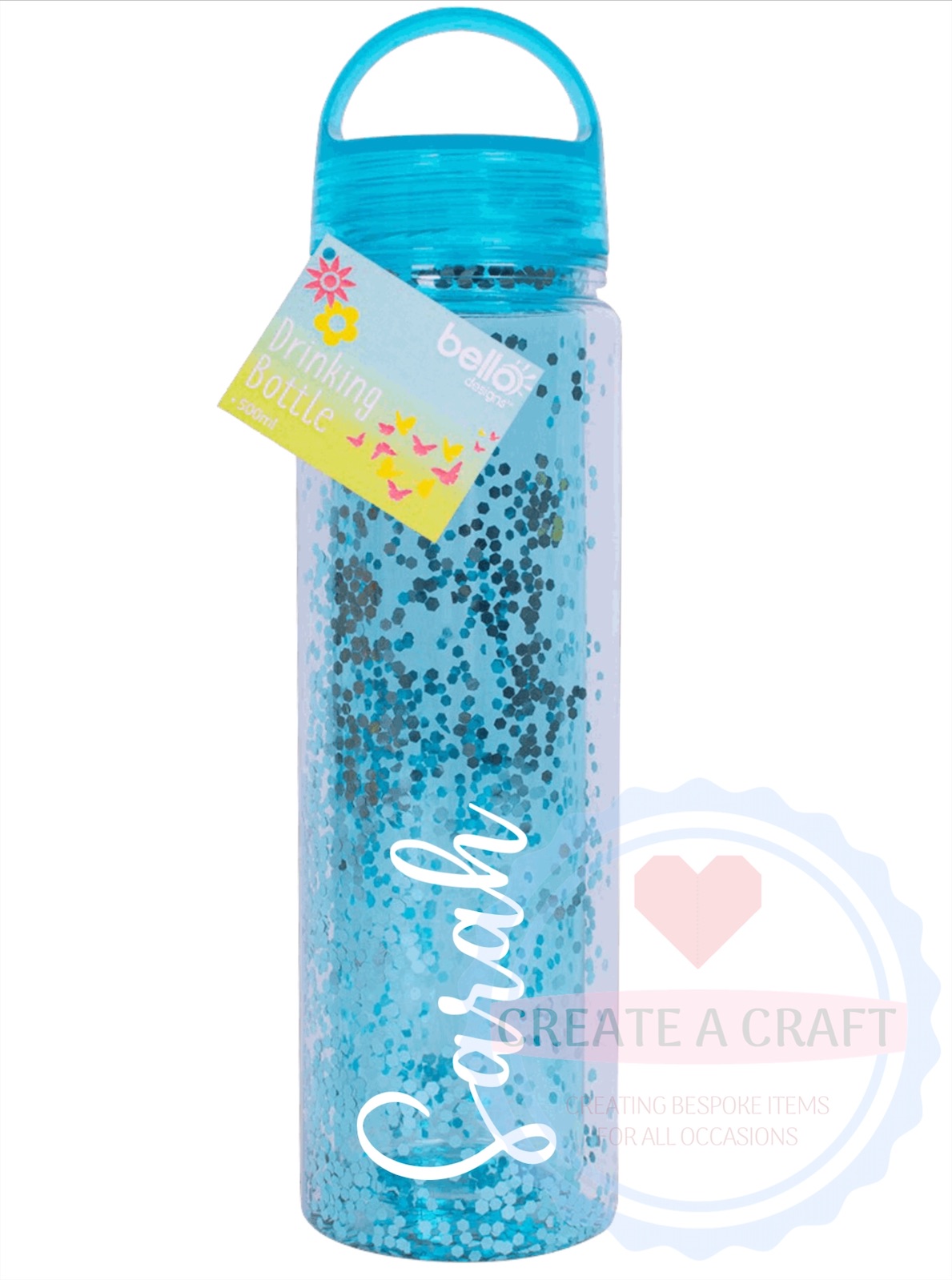 Glitter water bottles featuring a screw top lid with handle, a glitter filled base with coloured inner layer. Available in yellow, blue and red.