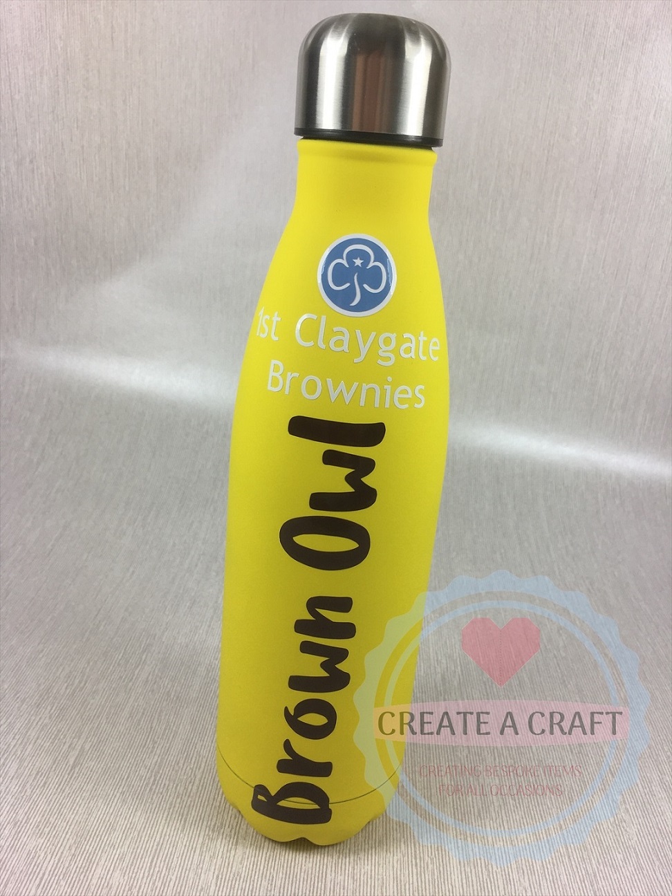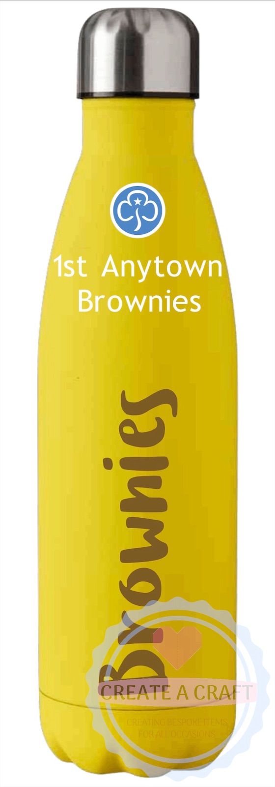 Yellow travel flask, personalised with girls’ name, Girlguiding trefoil and Unit/Area name.