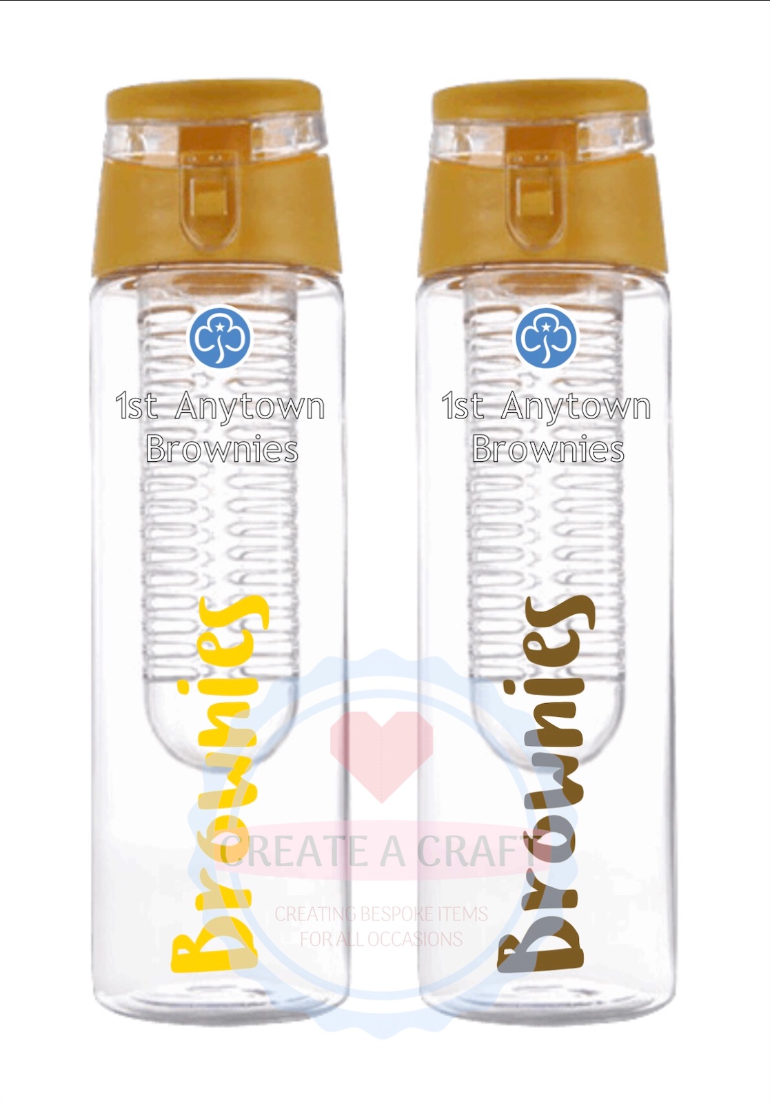 Yellow infuser water bottle, personalised with girls’ name, Girlguiding trefoil and Unit/Area name.