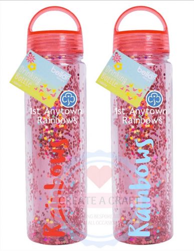 Red glitter water bottle, personalised with girls’ name, Girlguiding trefoil and Unit/Area name.