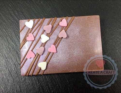 Chocolate bar made with the finest Belgian milk chocolate, topped with pink shimmer dust, a chocolate drizzle and sugar heart sprinkles.
