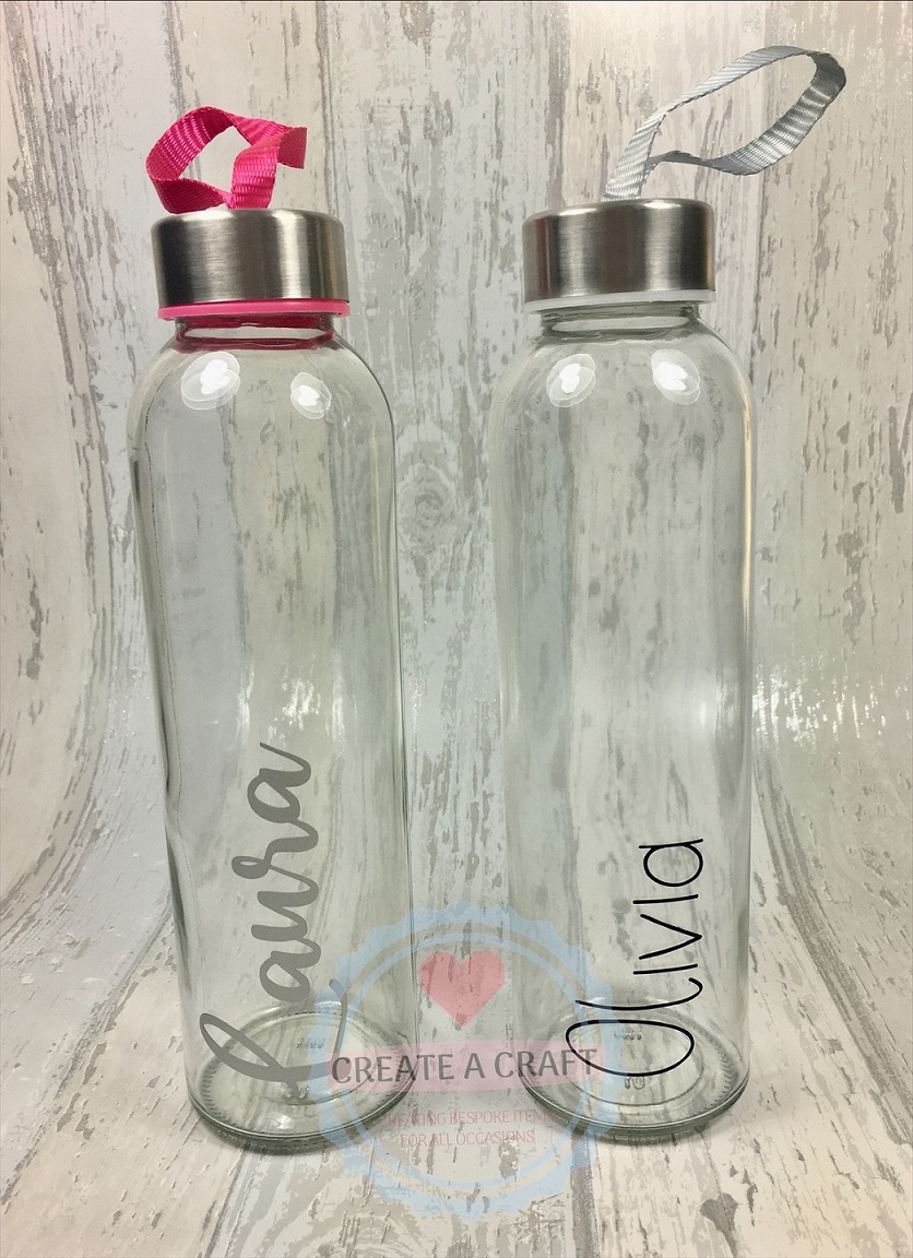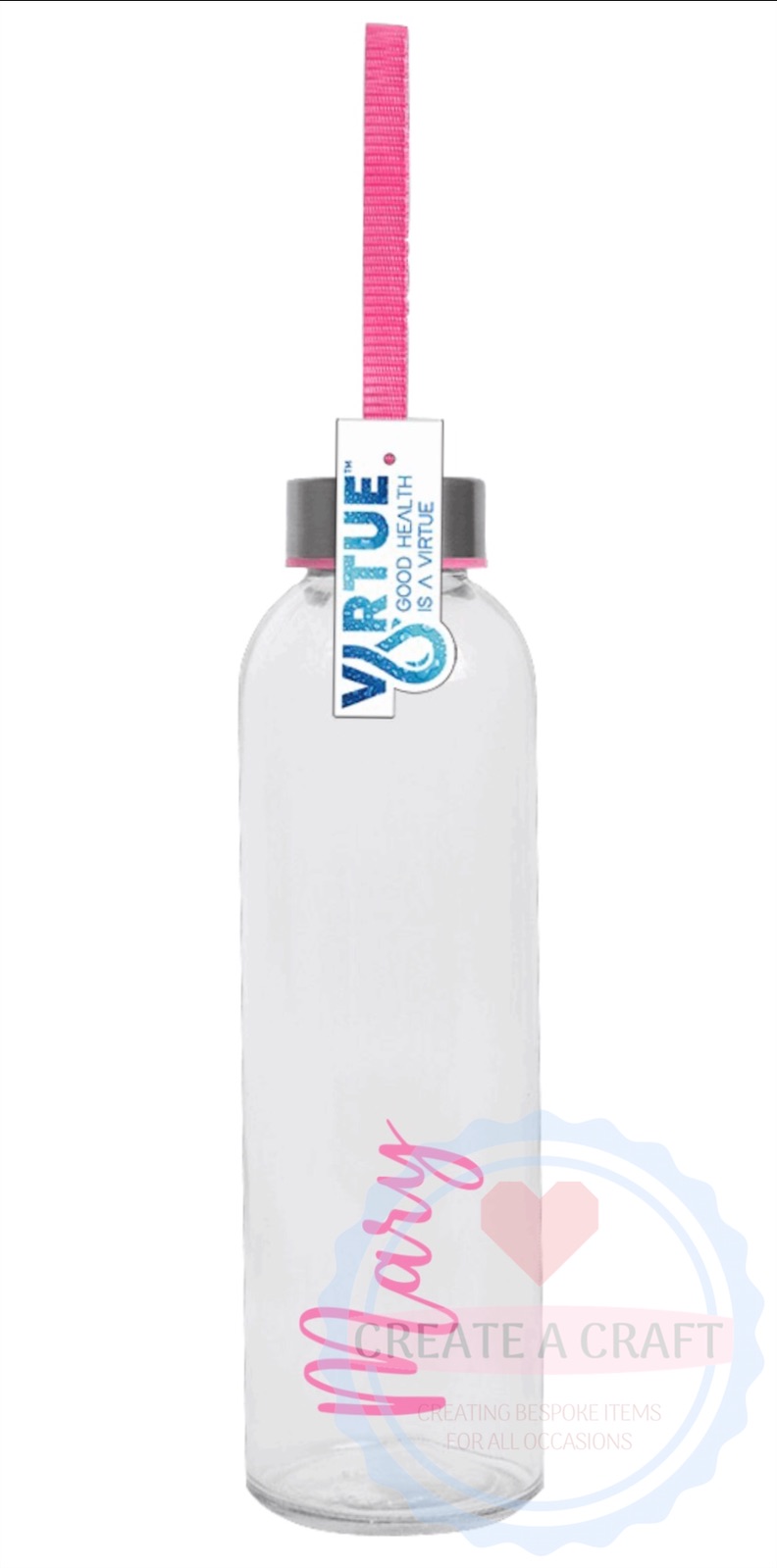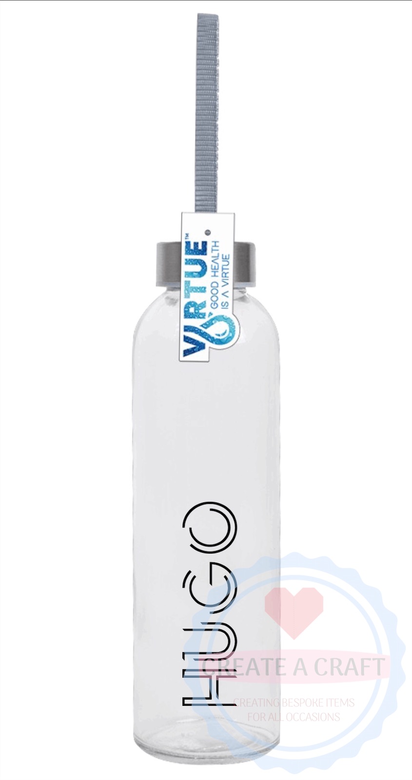 Glass drinking bottles, featuring a thick glass body, a metal lid with three assorted coloured plastic screw top inserts and a matching wrist strap. Available in blue, grey and pink.