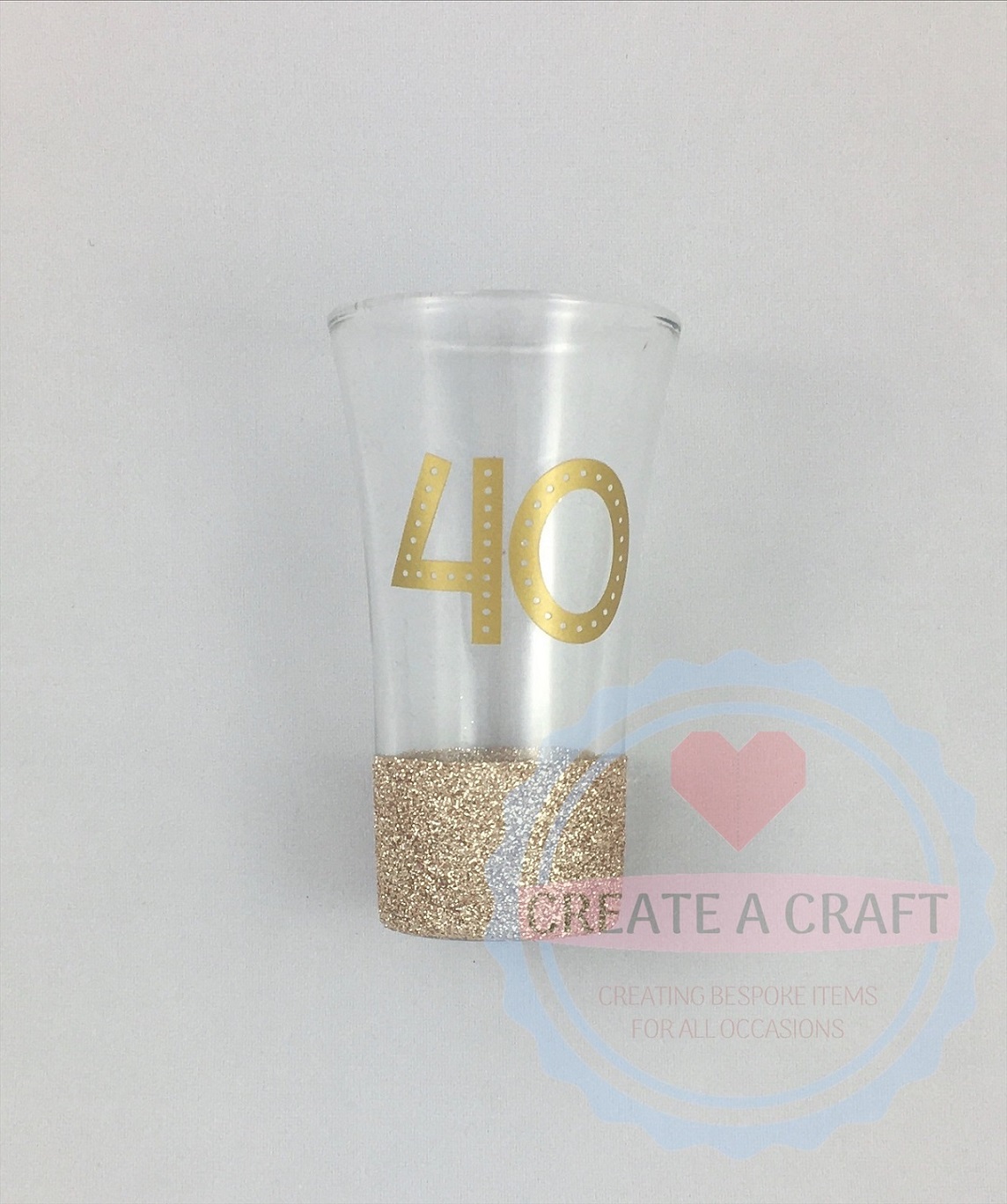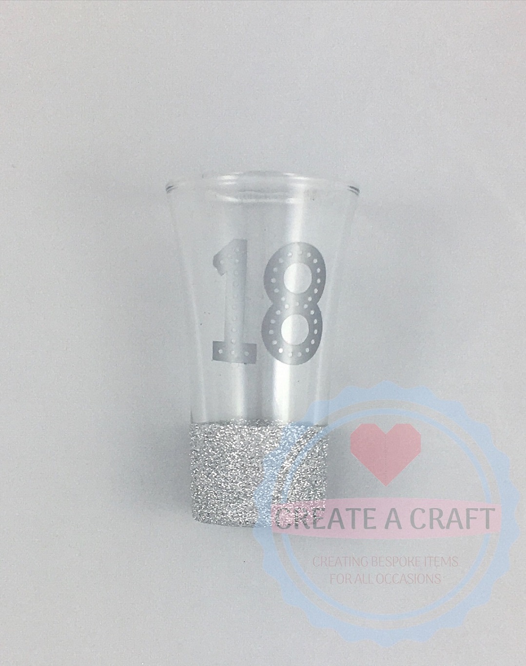 Shot glass, with glitter band in a colour of your choice and personalised as requested.