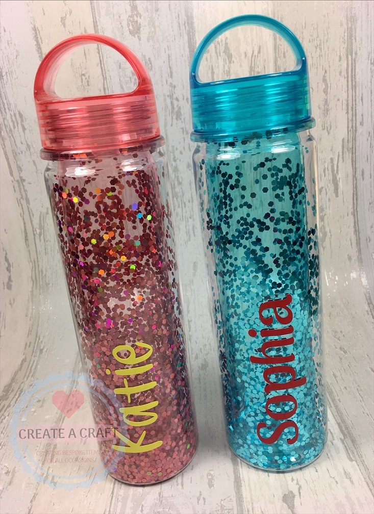 Glitter water bottles featuring a screw top lid with handle, a glitter filled base with coloured inner layer. Available in yellow, blue and red.